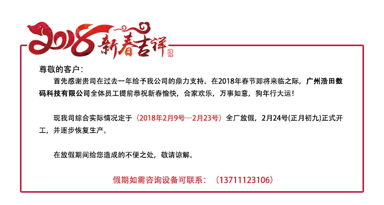 首先感謝貴司在過去一年給予我公司的鼎力支持。在2018年春節(jié)即將來臨之際,廣州浩田數(shù)碼科技有限公司全體員工提前恭祝新春愉快,合家歡樂,萬事如意,狗年行大運! 現(xiàn)我司綜合實際情況定于2018年2月9號(十二月二十三)至2月23號(正月初八)全廠放假,2月24號(正月初九)正式開工,并逐步恢復(fù)生產(chǎn)。